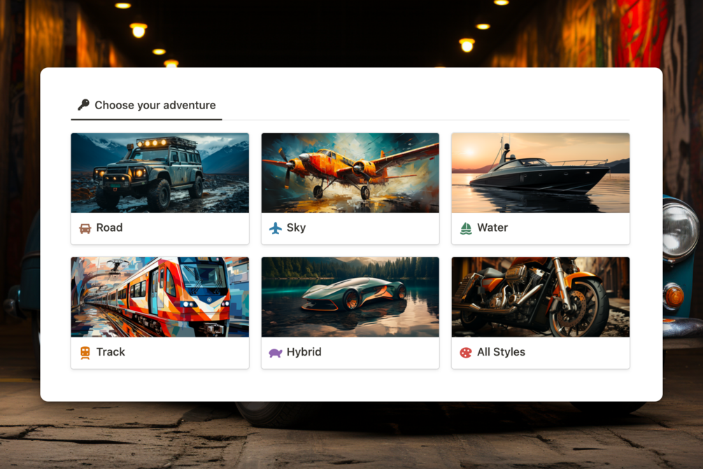 - A rich catalog of 50 unique vehicle prompt styles, spanning categories like Road, Sky, Water, Air, and Hybrid.